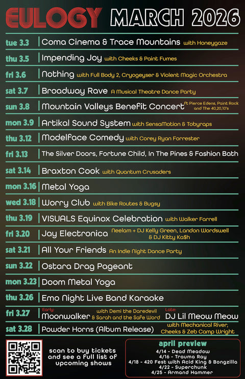 The price you see is all you pay. No hidden fees. Ever. Free Shows do not require tickets or RSVPs. All shows are all ages unless otherwise stated. Attendees under 18 must be accompanied by parent or guardian. Anyone under the age of 21 must vacate the premise at 11 PM.Full Calendar